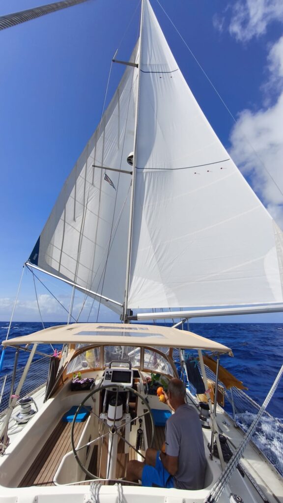 Am Donnerstag den 1.1. sind wir erst um 11.30 Uhr aufgestanden, gefrühstückt. Wir haben 147,7 sm in 24 Std. gesegelt. Wir hatten wieder Probleme mit dem Wassermacher. Heute war unser erster Duschtag an Bord. Um die Batterien aufzuladen haben 4 Std den Motor mit laufen lassen und den Wassermacher haben wir 4 Std laufen lassen. Heute haben wir 2 Delphine gesehen und abends gab es Nudelsalat mit Bockwürsten.