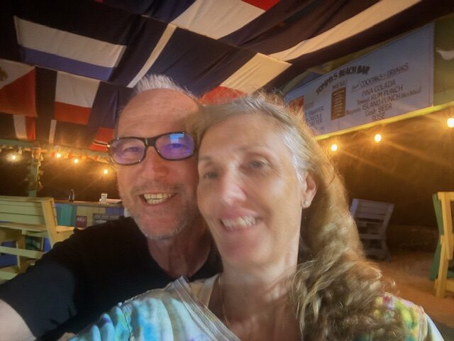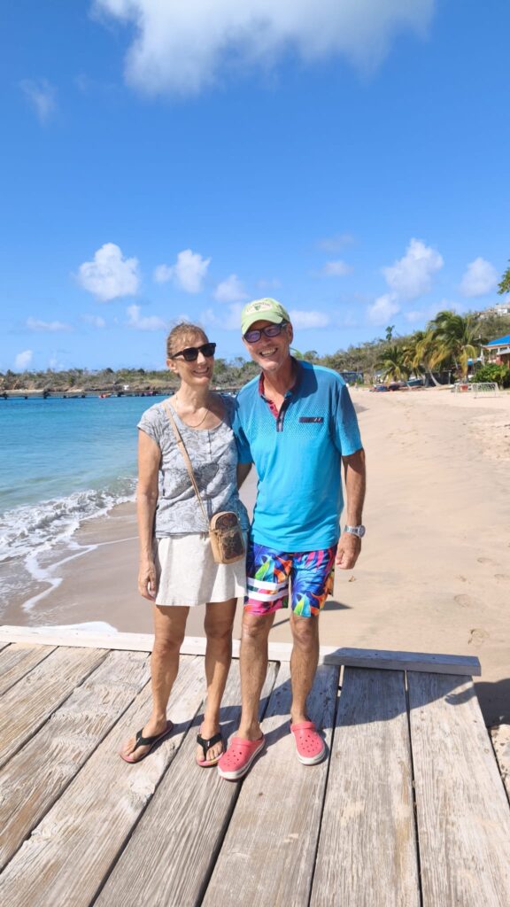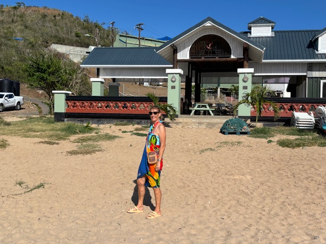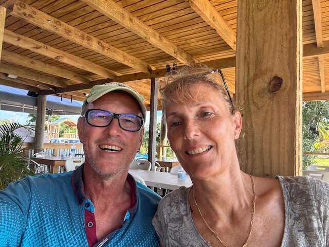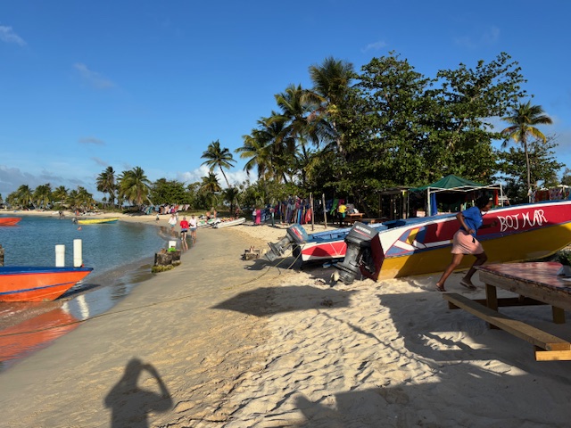 Am Dienstag 13.1. haben wir erst einmal lange ausgeschlafen, haben nur einen Kaffee getrunken und sind an Land gefahren. Wir haben unseren Müll entsorgt, sind nochmals in die Apotheke und haben Gunnar Wärmepflaster gekauft, danach sind wir zur Bank und hatten das Glück, daß heute weniger los war. Danach sind wir in eine Bäckerei haben Kaffee getrunken und Bananenbrot gegessen. Überall sind kleine Gemüse- und Früchtestände. Das Obst und Gemüse ist unheimlich teuer. Wir haben für eine Ananas 10,–€ für eine Tüte Paprika mit 5 Stück 20,00€ bezahlt. Wir waren so frustriert, daß wir uns in einer Strandbar erstmal ein Bier gegönnt haben. Bei dem Ausblick auf die Bucht und das Meer kam das lang ersehnte Karibik-Feeling bei mir auf. Ich wollte unbedingt, daß Gunnar das auch alles sieht. An dieser Bar war sogar direkt davor ein Anlagesteg. Ideal für Gunnar, da muß er nicht soweit laufen. Als wir wieder zurück an Bord waren, wollte Gunnar unbedingt, daß wir ihn ins Krankenhaus fahren, weil das mit den Schmerzen nicht viel besser (zulangsam) wird. Ich habe schon gemerkt, daß er eher psychisch einen kompletten Durchhänger hat. Ich machte ihm den Vorschlag, daß Andy und ich uns bis um 16.00 Uhr ausruhen, weil die Hitze macht einen ganz schön schlapp, und wir dann zusammen mit dem Dinghi direkt in die Bar mit dem Anlagesteg fahren. Dort haben wir erst einmal einen Cocktail getrunken. Sind ca 150 m mit ganz vielen Pausen in die nächste Bar gelaufen. Dort haben wir Julia aus Franken und Sigi aus Tübingen kennen gelernt. Wir haben mit ihnen zusammen ein Bier getrunken und abgewartet bis der Regen wieder aufhört. Danach sind wir wieder zurück zu der Strandbar und haben dort lecker gegessen mit karibischer Livemusik. Es war ein richtig toller Abend und Gunnar hat sich auch wieder besser gefühlt.