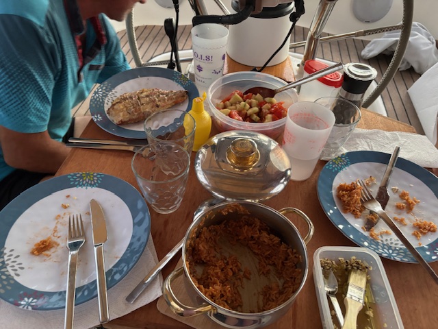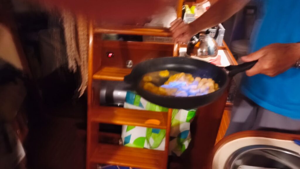 Am Samstag 27.12. haben wir nach 24 Std. 114,8 sm geschafft, abends gab es Ratatoui mit Reis, von 21.00 Uhr bis 4.30 sind wir motort, da der Wind nachgelassen hat.