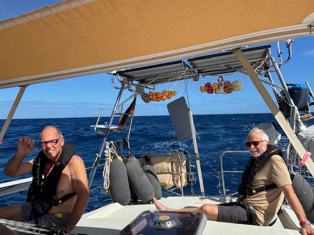 Am Freitag den 26.12. um 14.00 Uhr haben wir den Hafen von Mindelo verlassen. Die Welle ist gleich wie bisher, so dass wir weiterhin uns kaum ohne festhalten im Boot bewegen konnten. Unsere Nachtwache haben wir wie bisher beibehalten. Am Abend haben wir Käsemaccaroni und Tomatensalat gemacht.