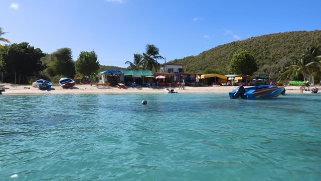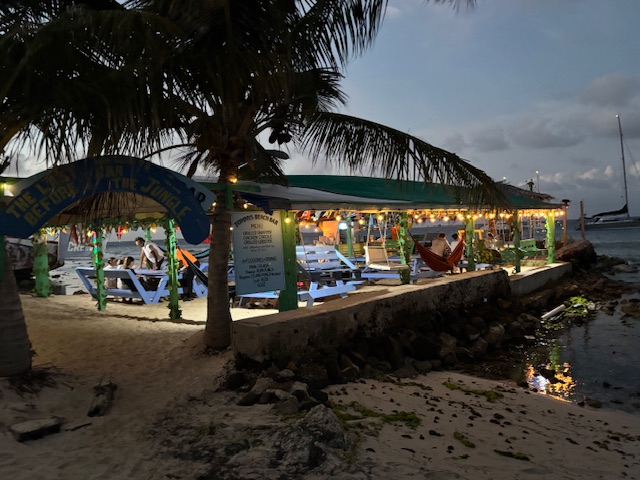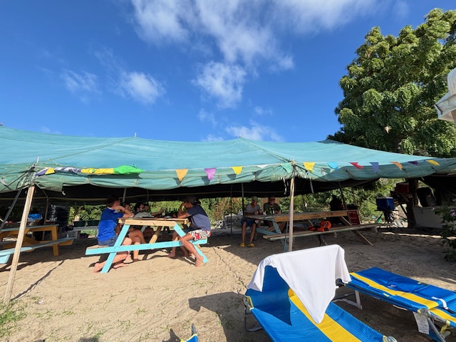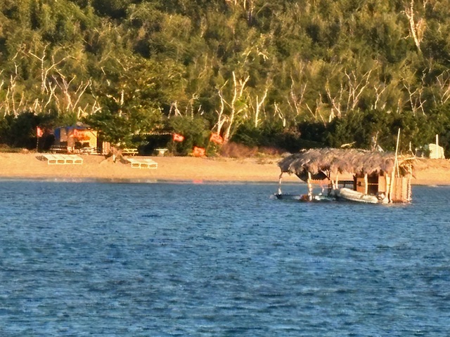 Am Donnerstag haben wir draußen gemütlich gefrühstückt, haben dabei das Treiben in der Bucht beobachtet. Ich bin nochmals an den Strand geschwommen und habe die andere Seite des Strandes begutachtet. Gunnar und Andy sind an Bord geblieben. Gegen 18.00 Uhr sind wir dann mit dem Dinghi in die Jungle Bar zum Abendessen gegangen. Wir haben Fisch mit Reis und einer gefüllten halben Kartoffel gegessen. Für den Preis von 30,– € war das Fischfilet recht klein. Alles was man hier kauft ist nur noch teuer und man hat das Gefühl man wird ausgenommen.