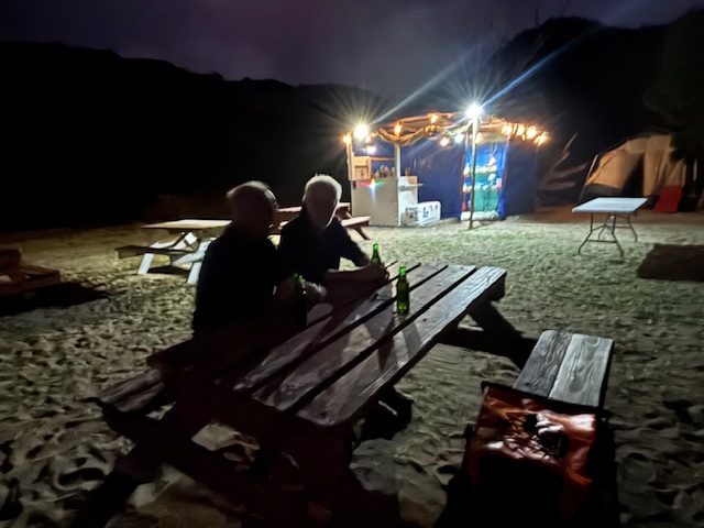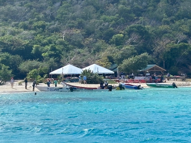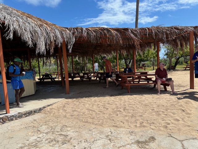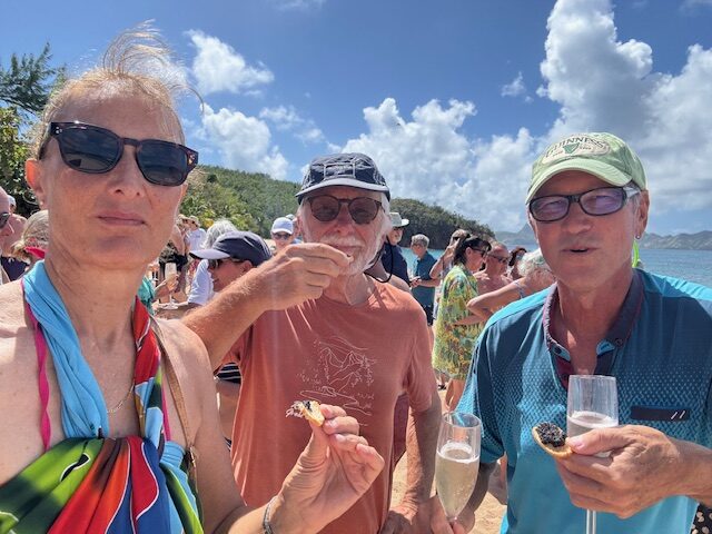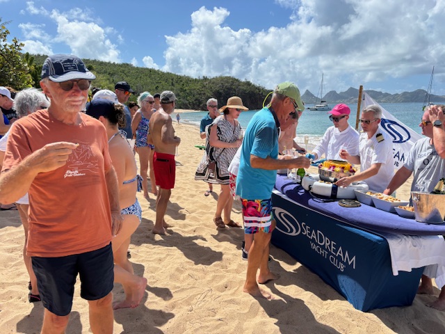 Am Donnerstag nach dem Frühstück wurden schon die ersten Gäste von der Sea Dream an Land gefahren und die Livemusik fing auch schon an zu spielen. Wir sind so um 11.15 Uhr auch an Land gefahren, da wurden wir gleich mit einem Begrüßungs Cocktail empfangen. Aus Höflichkeit haben wir nicht abgelehnt. Wir haben uns zu den Gästen gesellt und noch einen weiter Punsch getrunken. Dann wurde die Sektbar direkt am Strand eröffnet. Da haben wir noch ein Gläschen Sekt getrunken und Kavierkräcker dazu gegessen. Wir hatten ein nettes Gespräch mit einem New Yorker und haben uns einfach als Gäste der Sea Dream ausgegeben. Wir haben uns zum Mittagessen zu dieser New Yorker Gruppe gesellt und noch von dem tollen Büffett gegessen, danach haben wir einen Kaffee mit Cookies gegessen und haben uns dann so langsam von dieser Gesellschaft entfernt. Wie hat Andy in seinem Status geschrieben. „Wir wurden quasi unschuldigerweise mit dem Strom mitgerissen und waren genötigt, uns die Delikatessen mit einzuverleiben.“ Das Schwabenherz hat`s gefreut. Abends haben wir an Bord nur Krautsalat, eingelegte Auberginen mit frischen Brot gegessen. Es war ein toller Tag.