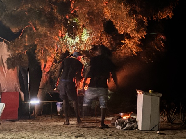 die Jungs grillen den Fisch bei Sonnenuntergang