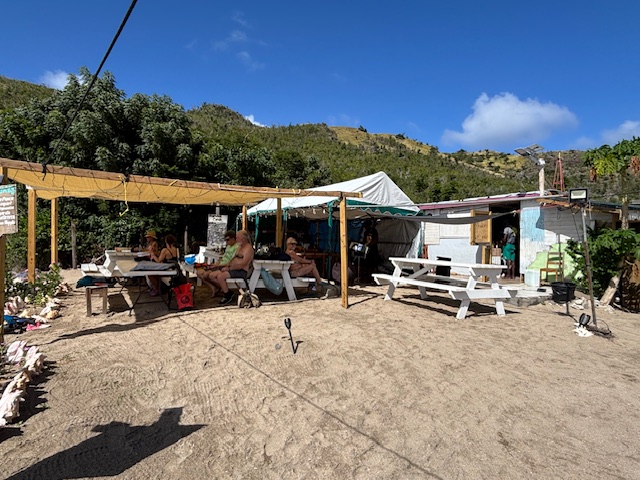 Am Mittwoch sind wir gegen Mittag mit dem Dinghi an Land gefahren und am Strand entlang gelaufen. Hier gibt es einen Salt Pond den wir noch besichtigen wollten, dieser war jedoch nichts besonderes. Gunnar benötigte wieder eine kleine Pause, so sind wir in die Loulou Bar gegangen und haben 2 Bier getrunken. Die Bierflaschen haben jedoch nur 280 ml. Wir haben uns die Speisekarte durchgelesen und beschlossen, daß wir abends hierher zum Essen gehen. Eine Einheimische hat uns erzählt, daß morgen das Touristenschiff Sea Dream kommt und die Live Steelband spielt. Wir sind um 18.15 Uht wieder an Land zum Abendessen gefahren. Die Bar war sehr gut besucht, jedoch die meisten haben nur etwas getrunken und sind schon bald gegangen. Es war ein Tisch mit 8 Personen vor uns zum Essen und noch ein 2 und 3 Personen Tisch zum Essen. Als wir bestellen wollten, sagte die Bedienung wir müssen noch kurz warten, bis das Essen an dem 8er Tisch serviert wird. Jetzt konnten wir unsere Bestellung aufgeben. Nach 1 Stunde fing Andy an, ich habe hunger, nach 1,5 Stunden kam die Bedienung und hat uns gefragt, was wir nochmals bestellt haben. Nach 2 Stunden kam dann das Essen. Zum Glück war das Essen gut und Gunnar hat eine Runde Bier für uns rausgehandelt. Der Preis mit 57,–€ war auch in Ordnung. Uns Deutschen fehlt einfach noch die Gelassenheit. Vermutlich müssen wir mal einen Joint rauchen, um runter zu kommen.