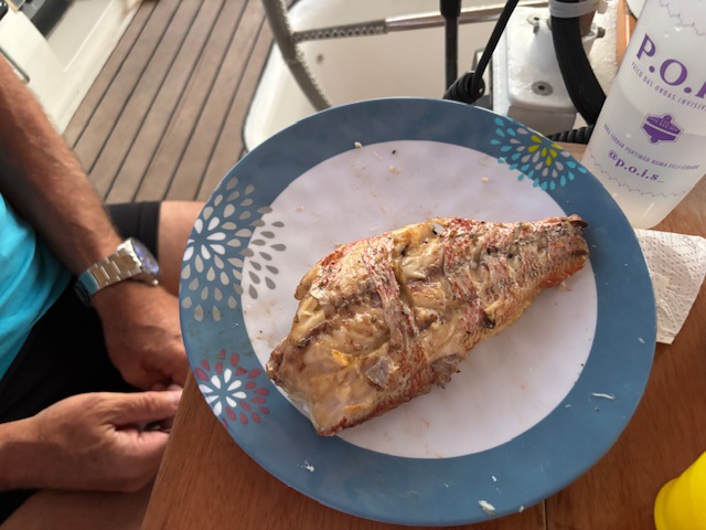 Am Dienstag nach dem Frühstück sind wir dann zu der Palm Island motort. Es haben dort keine Boote geankert. Wir konnten direkt an eine Boje festmachen und haben von Bord aus erst einmal die Insel bewundert. Türkisblaues Wasser, weißer Sandstrand, tolle Palmen. Wir sind dann mit dem Dinghi an Land gefahren, damit Gunnar wieder auf festem Boden etwas laufen kann. Wir wollten zu den Häusern laufen und diese begutachten, da kam schon ein Einheimischer und sagte uns, daß diese Insel Privat sei und wir nur am Strand entlanglaufen dürfen. Das haben wir auch gemacht und sind danach wieder an Bord. Nachdem unser Boot ziemlich ungeschützt an der Boje lag und der Seegang zunahm, haben wir beschlossen in eine geschütztere Bucht die Saline Bay zu motoren. Nach dem der Anker gesetzt war, kam schon der erste Einheimische und hat uns einen Red Snapper angeboten. Andy hat sehr stark verhandelt und wir haben 2 Fische für 50 EC$ statt 80 EC$ bekommen. Abends haben wir den Fisch gegrillt mit Tomaten-Gurkensalat und Vollkorn Basmati Reis. Wir sind sehr lange noch draußen gesessen und haben den Abend bei Rotwein mit Zigarre genossen.