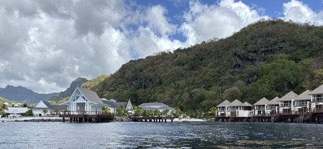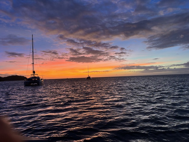 Am Samstag haben wir gemütlich gefrühstück und darauf gewartet, daß unsere Nachbarn (die Schotten) startklar sind. Wir mußten mit unserem Boot ein Stück nach vorne fahren, da ihr Anker evtl. unter unserem Boot liegt. Danach sind wir ins Wasser und haben unser Ruderblatt und die Außenbordwand von dem Algenbewuchs befreit. Ich bin mit der Taucherbrille unter Wasser und habe das Ruderblatt sauber gemacht und Gunnar hat mit der Schwimmschlange die Außenwand gesäubert. Beim säubern hat Gunnar festgestellt, daß bei unserem Truster ein Flügelrad fehlt. Er meinte, wir hätten einmal eine Leine dort reinbekommen. Wir haben das Dinghi zu Wasser gelassen und für unseren Landausflug startklar gemacht. Gunnar hat noch den Gefrierschrank abgetaut und ich habe für morgen einen Krautsalat vorbereitet. An Land haben wir einen Spaziergang gemacht und durften ein Stück am Strand entlang zum Resort laufen (das ganze Resort ist mit Security bewacht). Dort haben wir uns lange mit einer Einheimischen unterhalten. Sie sagte, wenn wir Billionäre treffen wollten, sollten wir dort an die Bar gehen. Schließlich hätten wir eine weiße Hautfarbe und man würde uns dort auch bedienen. Die einzelnen Häuschen, die direkten Zugang zum Meer habe, kosten pro Nacht 3.000 U$ und diese sind das ganze Jahr über ausgebucht. Wir haben noch unsere Bootsnachbarn, eine französische Familie (Sohn war bereits bestimmt über 30) getroffen. Sie sind mittlerweile schon 4 Jahre mit dem Boot unterwegs und auf dem Rückweg nach Frankreich. Abends haben wir in dem blauen Lokal gegessen und von der Terrasse aus den Sonnenuntergang genossen.