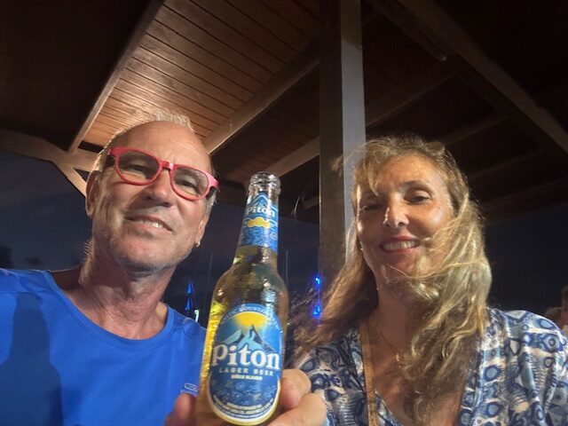 Am Sonntag sind wir nachmittags an Land und haben wie üblich unsere Runden gedreht, haben uns zwischendurch immer wieder hingesetzt und dann die nächste Runde begonnen. Wir haben schräg gegenüber unserer Stammbar „Boardwalk“ im Cafe einen Kaffe getrunken und wieder die nächste Runde begonnen. Mittlerweile kann Gunnar etwas schneller laufen und muß sich nicht mehr so oft bücken und sein Schienbein massieren. Heute geht es richtig gut. Abends sind wir wieder ins Boardwalk gegangen und haben Kev und Kelly aus England kennen gelernt. Wir haben mit Ihnen zusammen ein Pitch Piton gekauft. Das ist ein Eiskühler mit 6 Flaschen Piton für den Preis von 5 Flaschen. Dadurch ist es auch etwas später geworden. Im Hafenbecken ist der Dinghimotor bereits einmal ausgegangen, aber auch wieder gleich angesprungen. Jedoch ca. 20 m vor unserem Boot ist der Motor wieder ausgegangen. Gunnar hat immer wieder versucht den Motor zu starten, aber es hat nicht funktioniert. Wir hatten einen starken Wind und unser Dinghi trieb bereits an dem Catamaran hinter uns vorbei. Die Frau auf dem Cat hat uns gefragt, ob wir Hilfe brauchen und Gunnar sagte, wir haben ein Problem mit dem Motor. Ich sah, daß sie ihren Mann zur Hilfe holte und wir trieben bereits an dem nächsten Schiff vorbei. Ich habe die Taschenlampe immer auf die Frau im Cat gehalten, damit sie uns weiterhin beobachten kann. Wir hatten auch keine Paddel an Bord. Das Ehepaar kam mit ihrem Dinghi zu uns und unser Motor ist auch angesprungen. Sie haben uns begleiten und genau wieder kurz vor unserem Schiff ging der Motor aus. Sie haben uns dann zu unserem Boot geschleppt. Puhh das ging nochmals gut.