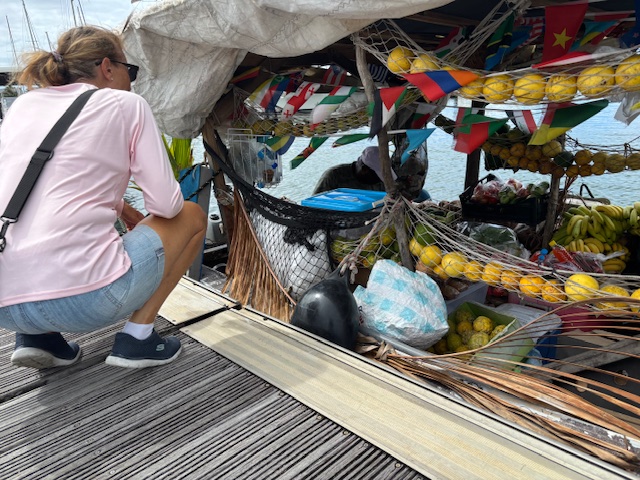 Am Samstag morgen auf dem Weg zur Dusche hatte Gunnar bereits wieder Schmerzen. Sein Oberschenkel hat sich wieder verkrampft. Vermutlich war das gestern doch zu viel. Ein Tag geht es gut, am nächsten wieder schlechter. Auf dem Rückweg habe ich bei dem schwimmenden Obsthändler noch ein paar Mango´s gekauft. Wir haben gefrühstück und fast 1 Stunde mit Ute telefoniert.