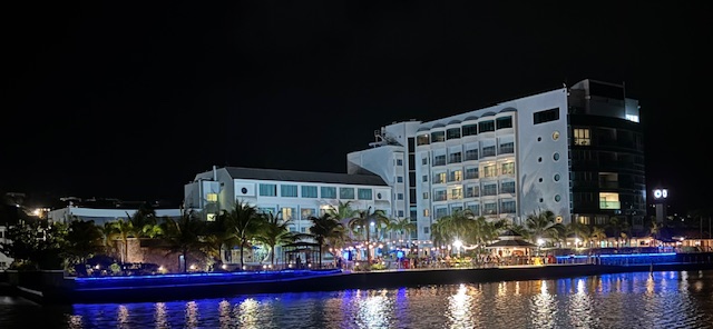 die Hotelanlage nachts / tags gegenüber unserem Liegeplatz