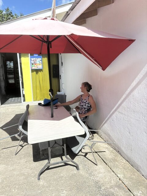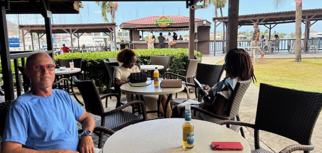 Wir haben den anderen zurück gegeben und unser Tag (um 11.00 Uhr) war gerettet. Also sind wir direkt in die Eckkneippe am Dinghidock. Vorher haben wir uns an einem Stand, nachdem am Samstag Markt ist, noch 2 Portionen Chicken gekauft. Dazu ein Carib und Hairoun getrunken. Andrea und ihr Mann kamen auch noch, ein Freund aus Deutschland von ihr, der auch mit dem Segelboot unterwegs ist, kam dazu, Sonja die schon 30 Jahre in Bequia lebt war dabei und zum Schluß noch ein Segler aus Feldkirch. Der deutsche Stammtisch ging länger. Nachdem 4. Bier haben wir uns dann um 15.00 Uhr verabschiedet und haben an Bord erst einmal einen Mittagschlaf gemacht.