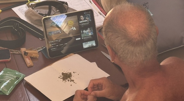 Am Mittwoch sind wir schon vor dem Frühstück ins Wasser. Heute ist es recht unruhig und windig in der Bucht. Ich schreibe an unserer Homepage und Gunnar versucht laut Anleitung einen Joint zu drehen. Der gestern hat nicht so richtig funktioniert.
