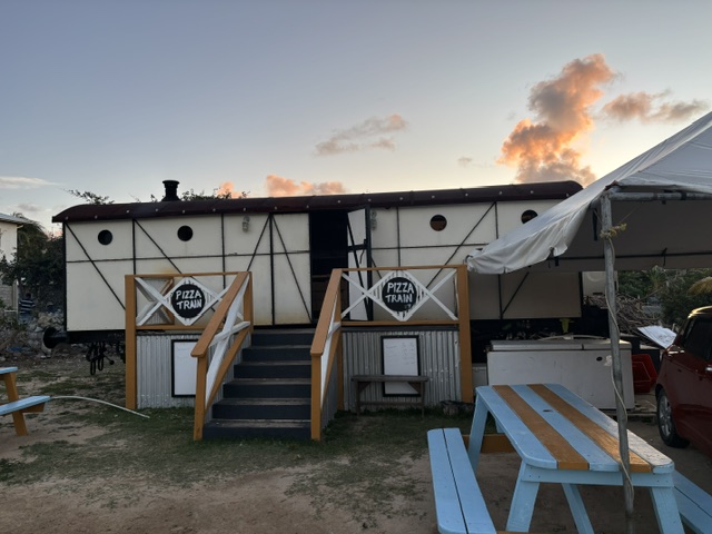 Am späten Nachmittag sind wir an Land und haben im Souvenirladen noch eine Kaffeetasse von Canouan mit einer Schildkröte gekauft. Wir sind nochmals an der Kneipe „Schuppen“ vorbei und haben dort noch ein Bier getrunken. Ein Einheimischer war total begeistert, dass wir uns zu Ihnen gesellten. Er hat uns erzählt, daß sich hier nur Einheimischen treffen und ganz selten Touristen hier etwas trinken. Wir sind dann wieder runter an den Strand und wollten eigentlich in der Coconut Bar etwas essen, aber diese hatte leider zu. Auf dem Weg haben wir nochmals Fisherman Paul getroffen, wir haben uns kurz mit ihm unterhalten und haben am Pizza Train gegessen. Dort hat ein Einheimischer seine Musikbox aufgestellt und karibische Musik gespielt. Die Einheimischen standen an der Straße entlang und haben sich unterhalten und sich nach dem Rhytmus dazu bewegt. Auch Fisherman Paul war dabei. Gunnar hat ihm ein Bier ausgegeben, da hat er sich unheimlich darüber gefreut. Wir haben ihm danach noch unsere restliche Pizza gegeben, da uns zusammen diese Pizza einfach zu viel war. Er hat mich noch nach 5 ecs (1,70€) gefragt, für einen Joint. Ich habe ihm 10 gegen und er halt sich unheimlich gefreut und bedankt.