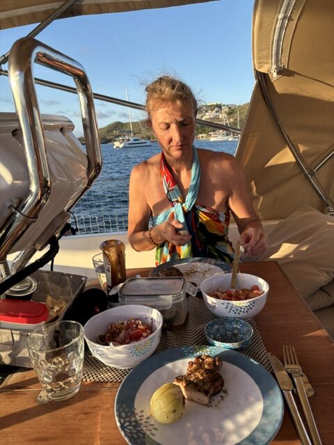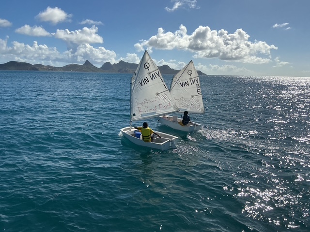 Am Donnerstag sind wir gegen 10.00 Uhr zur Saline Bay gesegelt. Wir haben unseren Anker gesetzt und den Tag über an Bord genossen. Wir sind schwimmen gegangen und mittags haben Kinder mit ihren Optis`s und Sunfish trainiert. Sie haben unser Schiff als Rundungsboje benutzt. Den ganzen Mittag sind sie um uns herum gesegelt.
