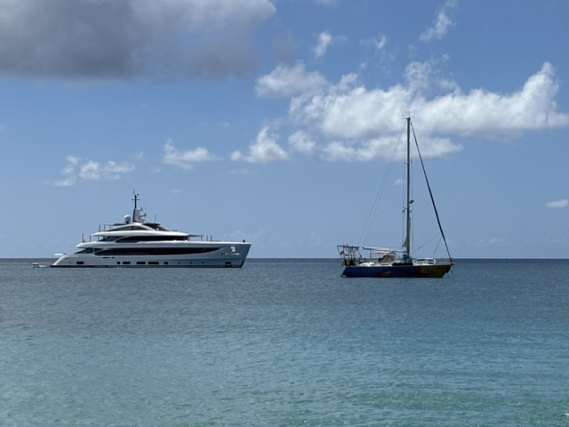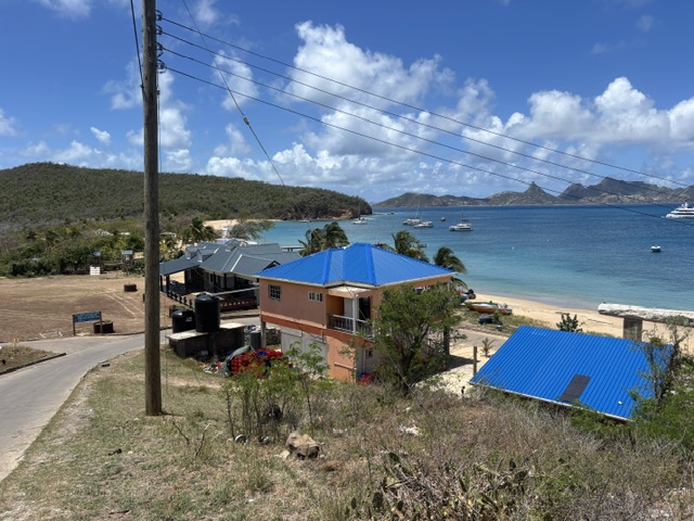 Am Freitag sind wir erst so gegen 12.00 Uhr mit dem Dinghi an Land gefahren. Wir sind in das Dorf hoch gelaufen. Die Schule ist ganz oben auf dem Hügel und von dortaus hatten wir einen tollen Blick auf Canouan, die Tobago Cays und Union Island. Das Wasser ist herrlich türkisblau. Auf dem Rückweg sind wir an der Bäckerei vorbei gekommen, da hat der Besitzer uns zu sich gerufen und als er hörte, dass wir aus Deutschland kommen hat er uns die komplette aristokratische Verbidungen zu Hannover erklärt. Bis zurück zu Bismark und Napoleon. Geschichte ist sein Hobby. Seine Schwester kam später noch dazu, diese hat immer wieder die Augen verdreht. Er war total happy, daß er sein Geschichtswissen loswurde. Wir gingen weiter bergabwärts, da hat uns der nächste ansprochen und gefragt, ob wir ein Bier möchten. Dazu haben wir ja gesagt, dabei hat er uns gefragt, woher wir kommen und wo wir schon überall waren. Er erzählte uns, daß er 66 Jahre alt ist und als Motoringenieur auf großen Schiffen gearbeitet hat. Dadurch war er auf der ganzen Welt viel unterwegs, aber jetztz möchte er wieder in seiner Heimat sein und baut sein Haus wieder auf nach dem Hurrikan. Zum Schluß waren wir noch auf der Rückseite der Upper Bay und haben The Ranch Escapade besichtigt. Wir haben noch 2 Red Snapper von einem Fischer abgekauft, die wir morgen grillen werden. Heute grillen wir noch unser Schweinefleisch.